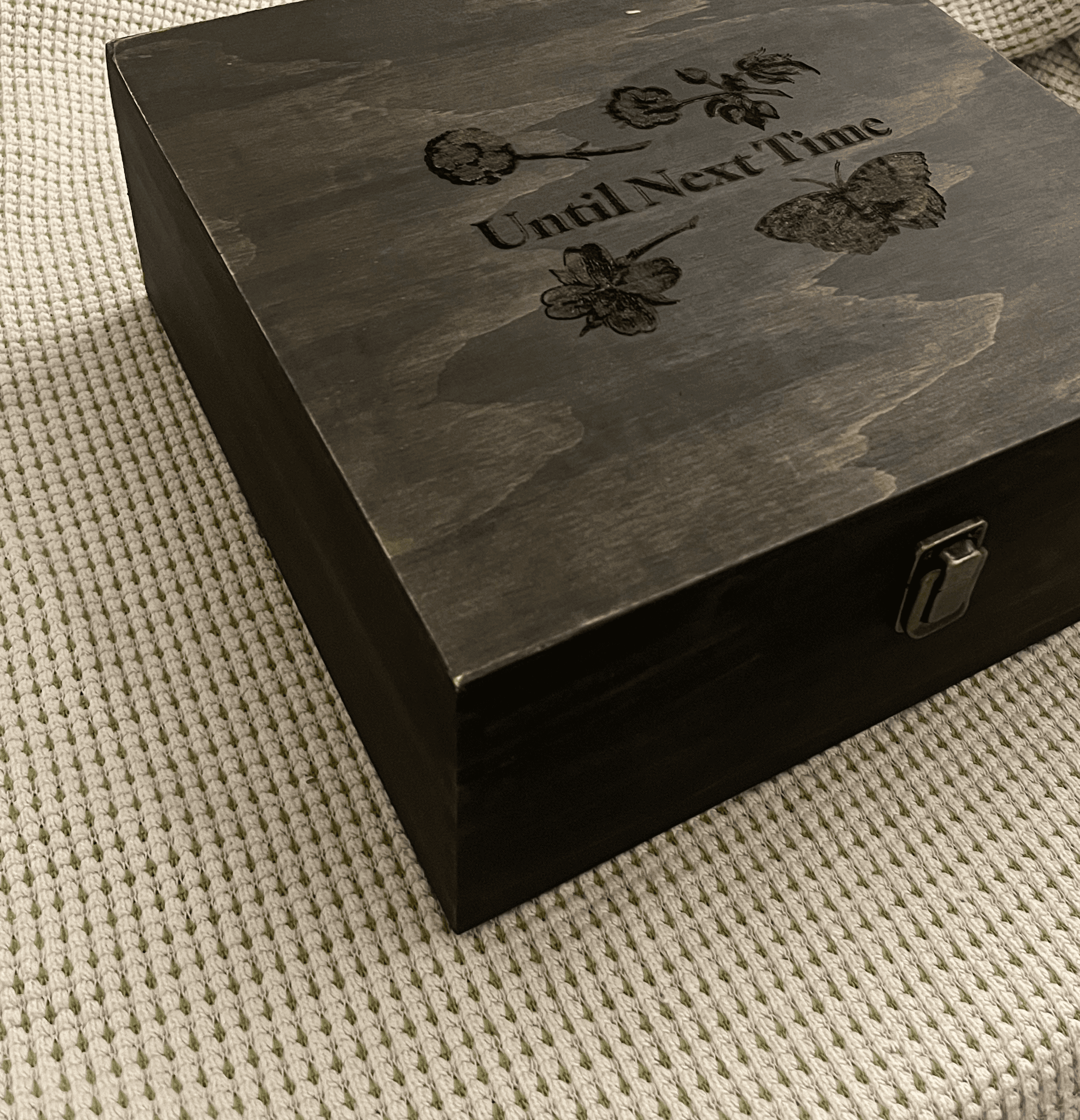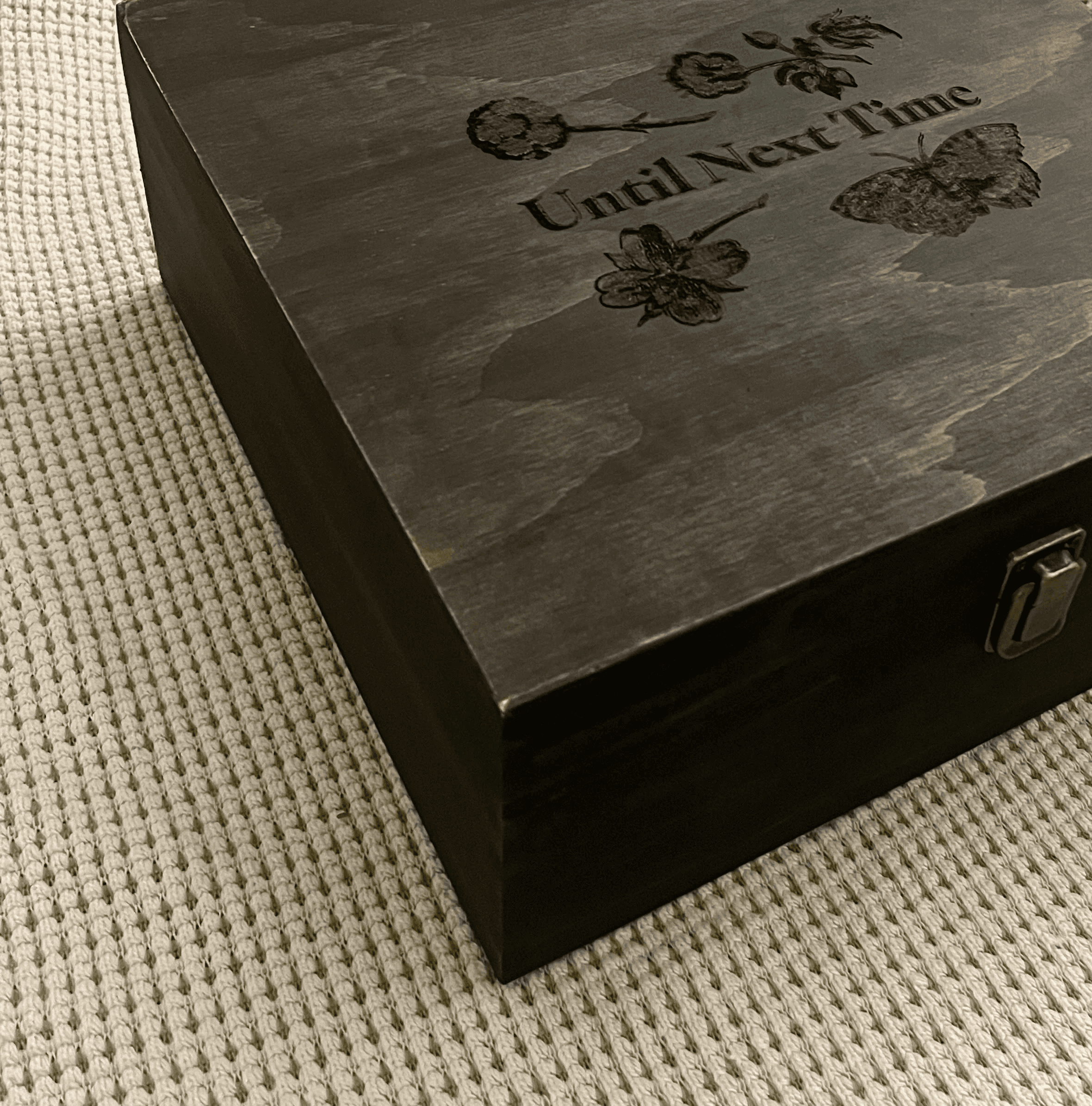 Hand-built from solid pine from the Pacific Northwest, this heirloom box is lined with black felt to cradle each letter and envelope with care. The hinged back and front clasp ensure your memories stay protected, while the exterior features engraved original artwork created exclusively for Until Next Time