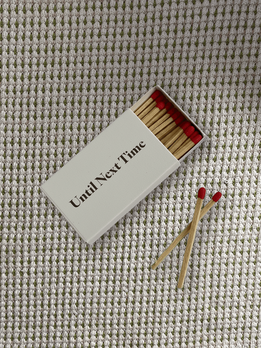 The Until Next Time Matchbox is our take on the perfect small object; a piece you don’t hide in a drawer, but leave out because it completes a room. Each box holds a generous bundle of red-tipped matchsticks and is wrapped in a custom illustration created exclusively for Until Next Time, printed with archival inks for richness and longevity