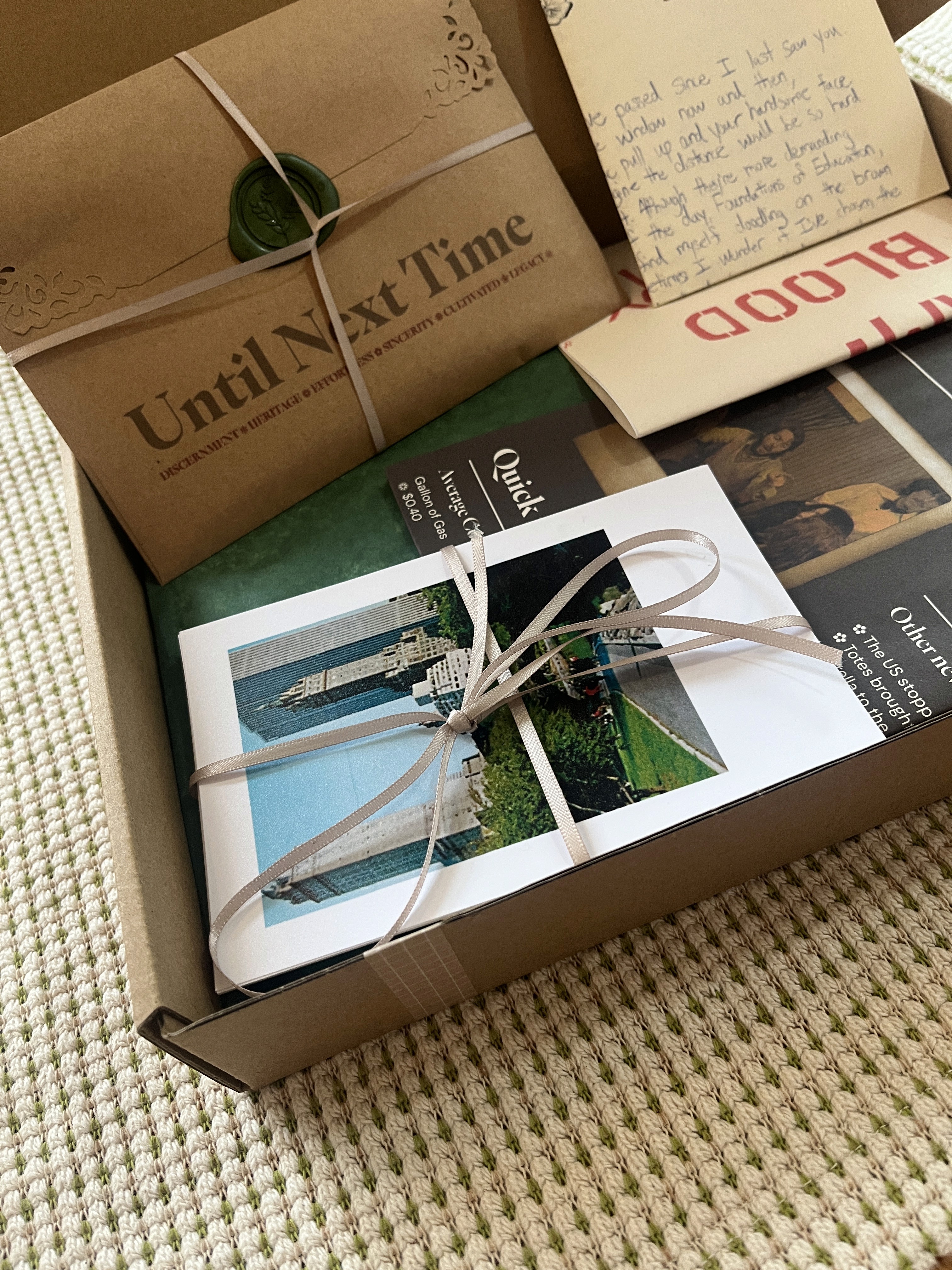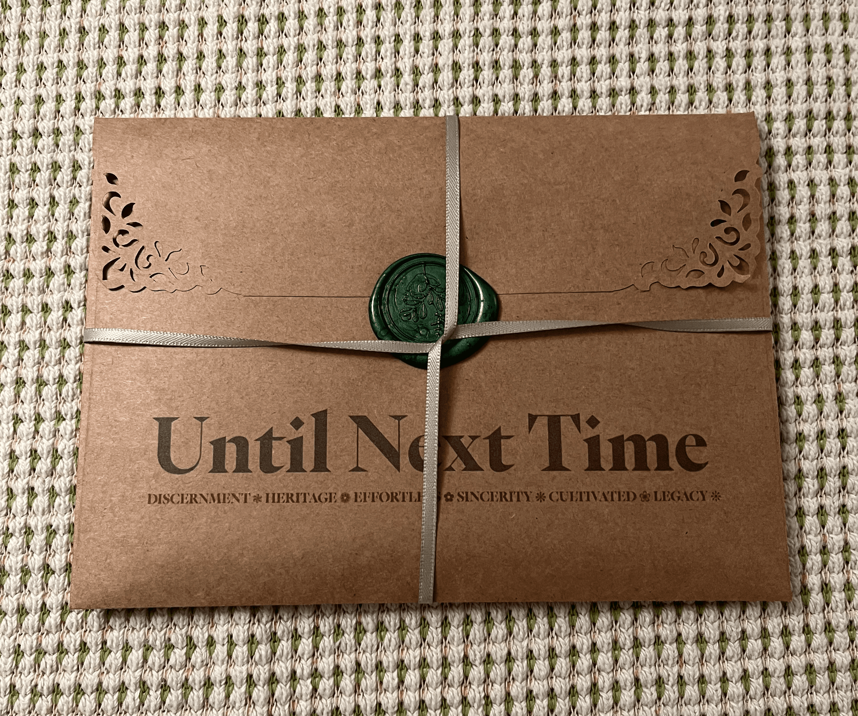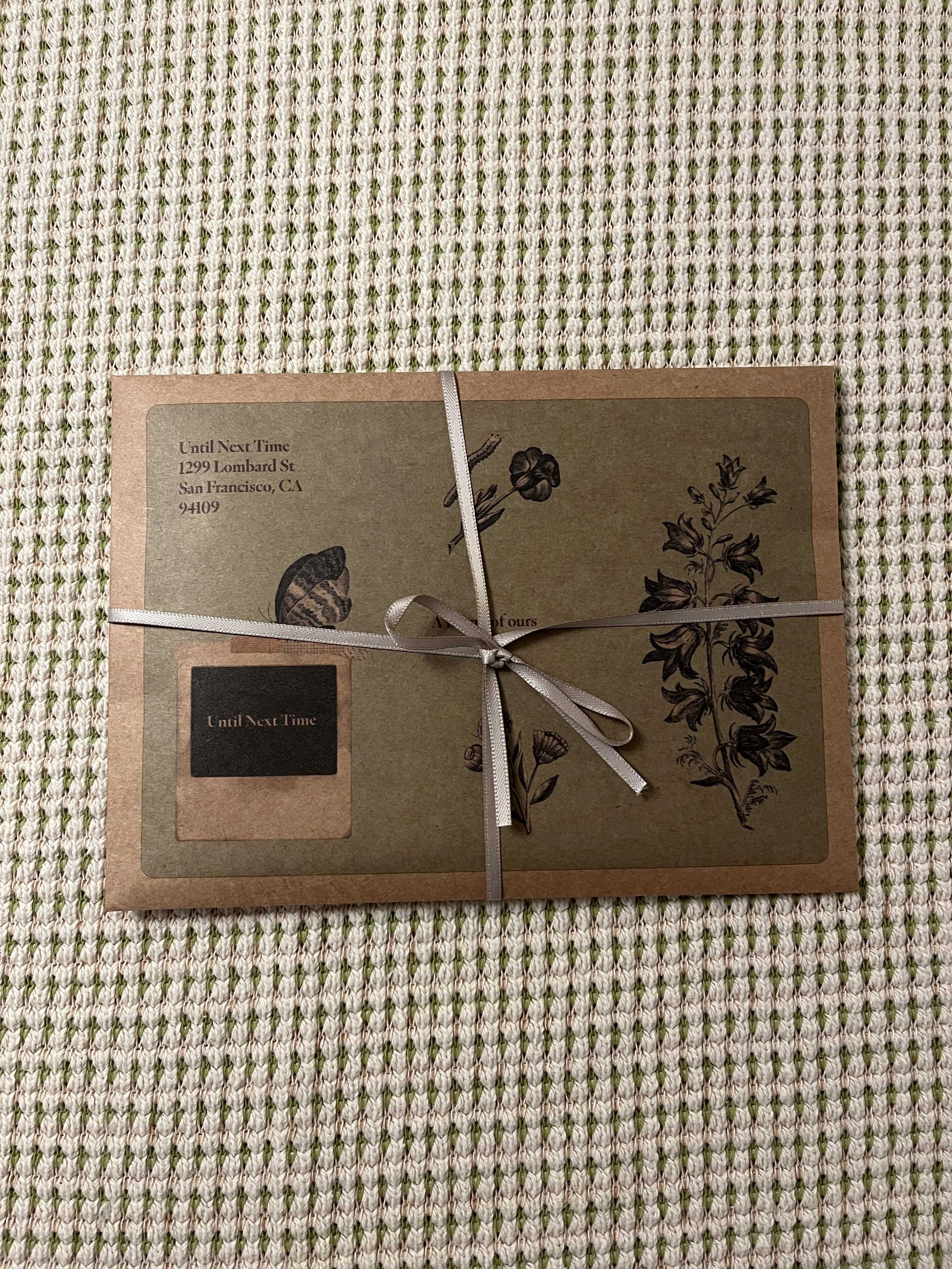 The package of the kraft envelope is hand-sealed with melted wax and is tied with real silk. Each envelope includes at least 2 of the following inserts, in addition to the letter